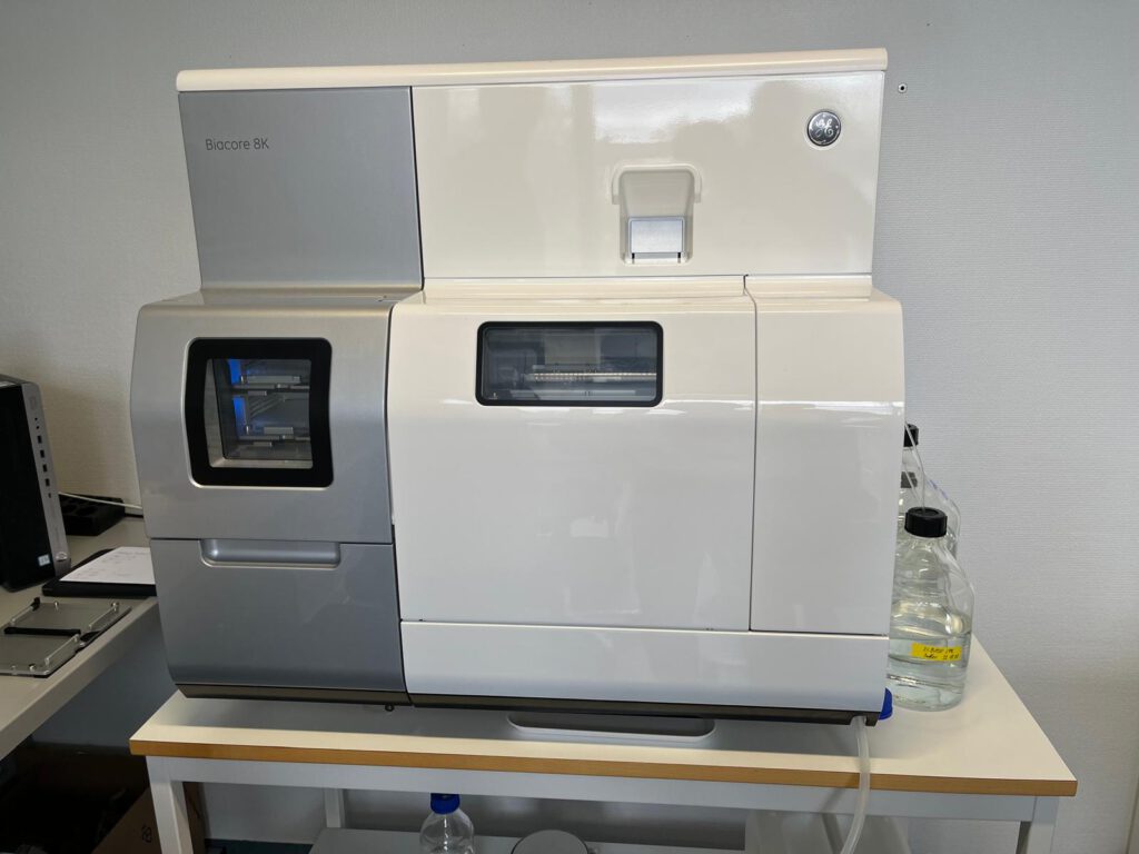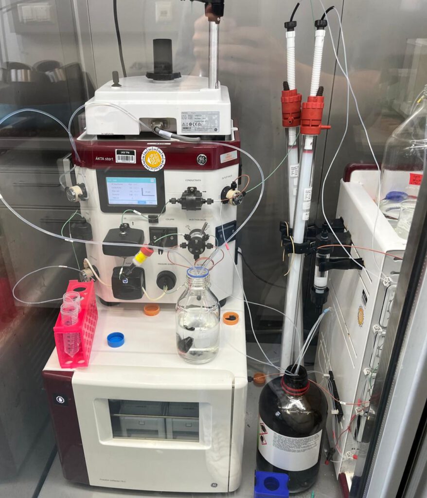 Die gefilterte Lösung wird anschließend nach dem Zielprotein aufgereinigt. Im Zuge einer Chromatographie an der “Äkta Start“ wird die Proteinlösung durch eine mit einem speziellen Zucker gefüllte Säule geleitet. Äkta Start ist ein Gerät zur automatischen Reinigung von Proteinen, bei dem eine Proteinlösung durch eine spezielle Trennsäule geleitet wird. Aufgrund einer TAG genannten Änderung der Struktur des Zielproteins während der Expression bindet dieses an dem in der Säule enthaltenen Stoff, wobei die anderen Proteine durch diese hindurch gespült werden. Mithilfe einer Pufferlösung, die das gebundene Protein wieder aus der Säule löst, wird das Zielprotein schließlich in kleine Proberöhrchen gespült. Durch die Trennung in diese Fraktionen wird gewährleistet, dass das Protein nicht durch den Puffer verdünnt wird.