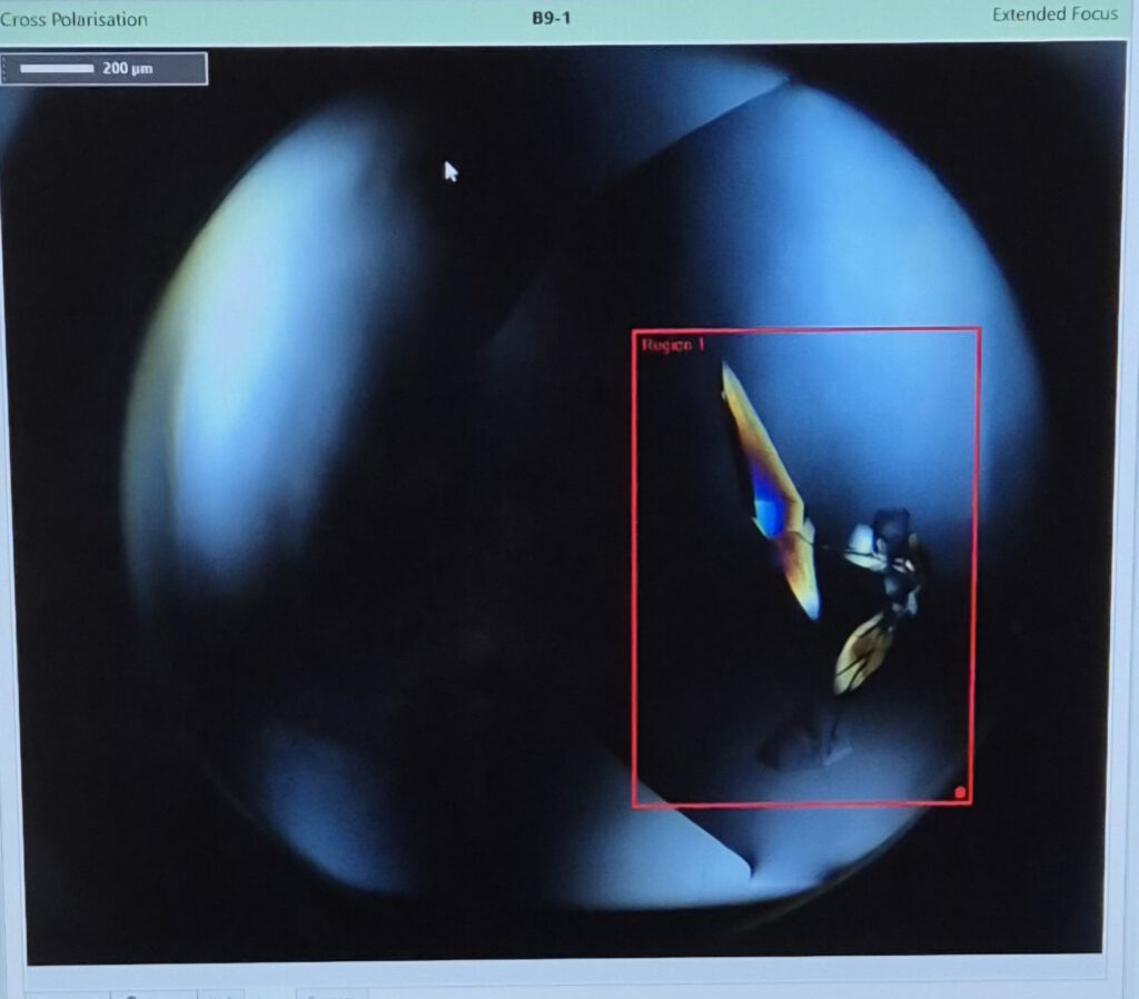 Im Labor wurde uns gezeigt, wie dieser Prozess technisch umgesetzt wird. Mithilfe einer Maschine namens “Gryphon“ konnten winzige Mengen Proteinlösung automatisiert in verschiedene Bedingungen pipettiert werden, um optimale Kristallisationsvoraussetzungen zu finden. Anschließend wurde an einer weiteren Maschine ein Bild der Kristallstrukturen aufgenommen, um sichtbar zu machen, wie die Kristalle geordnet sind und sie so für spätere Röntgenanalysen vorzubereiten.