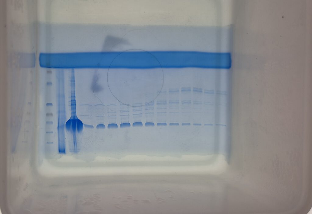 Im Anschluss folgte eine Gelelektrophorese mit einem SDS-Gel. Hierbei wandern Proteine unter elektrischer Spannung in einer gewissen Zeit unterschiedlich weit durch ein Gel. Nach dem Färben konnten die entstandenen Banden ausgewertet und die Reinheit der Proben überprüft werden.