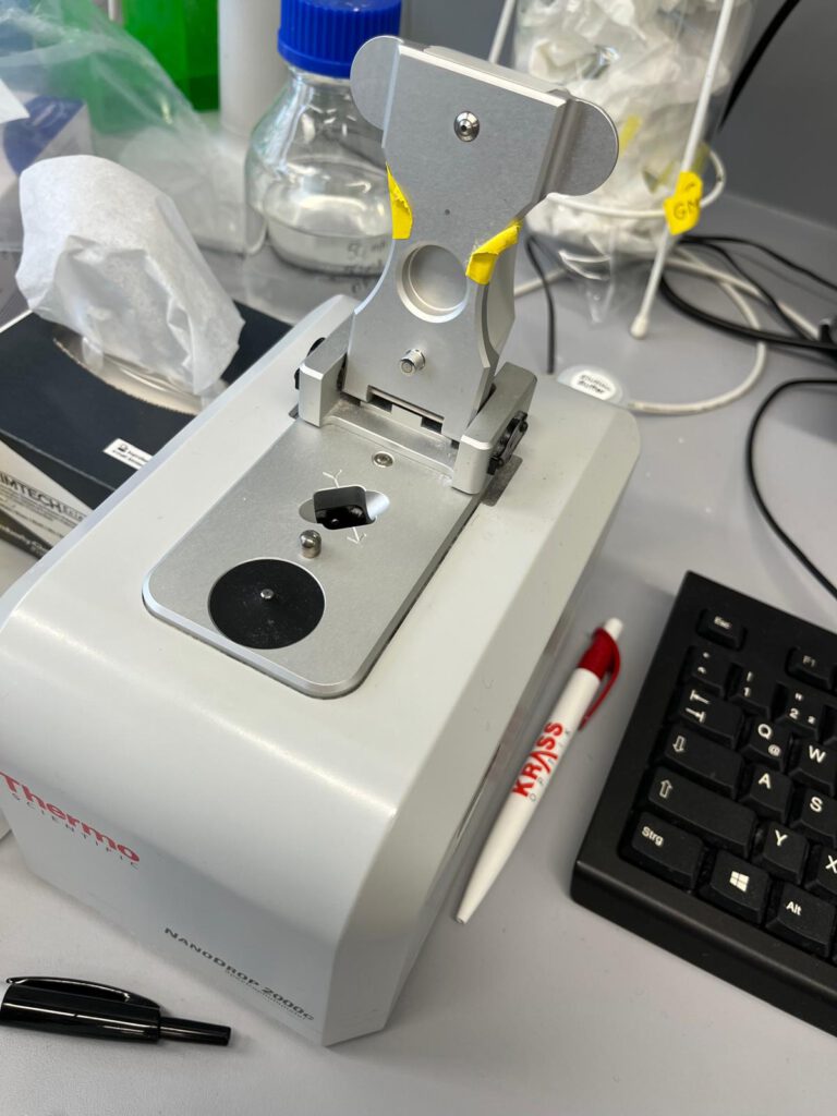 Aus den Proben mit dem höchsten Reinheitsgrad wird dann eine sogenannte Stock-Lösung erstellt, deren Konzentration zunächst bestimmt werden muss. Dies geschieht, indem ca. 2µl der Stock-Lösung auf ein Gerät (Nanodrop) getropft werden, welches den entstandenen Tropfen durchleuchtet und anhand der Lichtbrechung die Proteinkonzentration bestimmt.